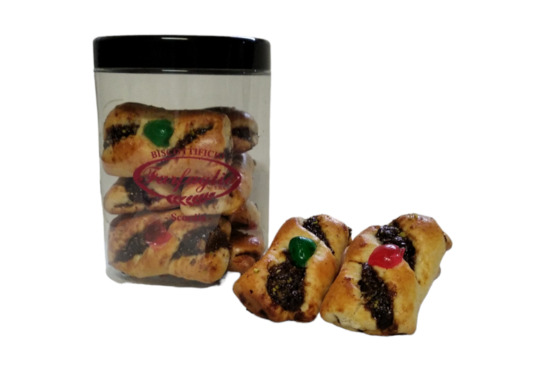 Antico biscotto della tradizione sicilianaFrolla ripiena di fichi secchi, mandorle, scorze d'arancia, uva passa.Ingredienti: farina di grano tenero 00, zucchero, margarina, uova fresche, latte, lievito, bicarbonato di ammonio, cannella, aromiRipieno: fichi secchi, mandorle, scorze d'arancia, vino marsala, cioccolato fondente, marmellata d'arancia, uva sultanina Barattolo da 350gr in plastica alimentare riutilizzabile